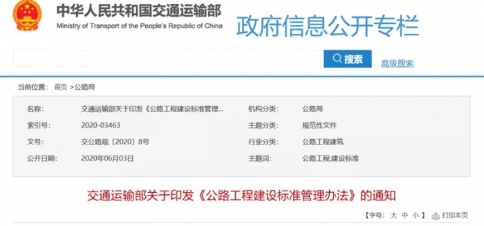 近日,交通運輸部發布《關于印發<公路工程建設標準管理辦法>的通知》。該辦法共五章二十八條,自2020年7月1日起施行,有效期5年。