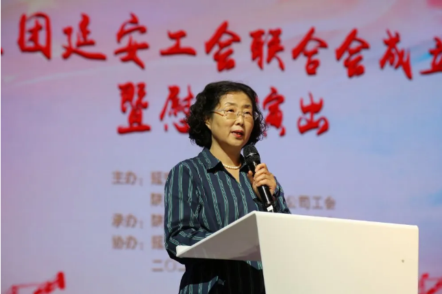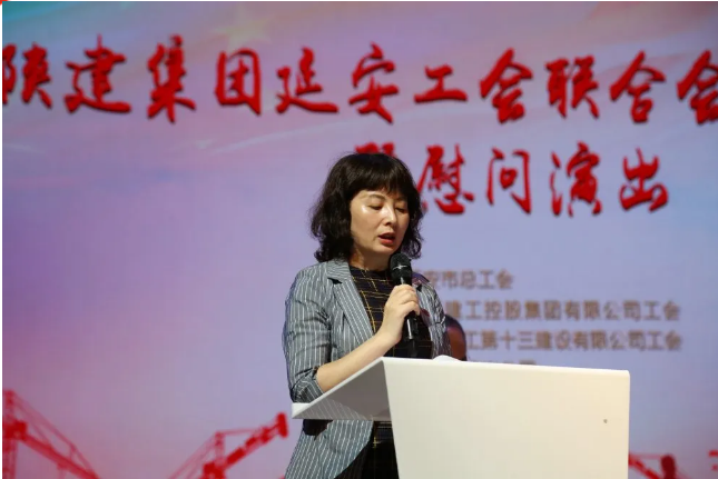 陜建集團女工委主任、機關工會主席劉愛英同志宣讀陜建集團工會成立延安工作站的文件。