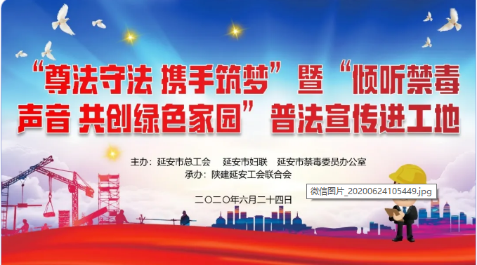 在第33個國際禁毒日來臨之際,為全面貫徹落實習近平新時代中國特色社會主義思想和習近平總書記關于禁毒工作重要指示精神,切實提高農民工法律意識和禁毒意識,6月24日,由延安市總工會、市婦聯、市禁毒委員辦公室主辦,陜建延安工會聯合會承辦的“尊法守法 攜手筑夢”暨“傾聽禁毒聲音 共創綠色家園”普法宣傳教育活動在陜建十三建公司延安市新區信天游文創餐飲街項目舉行。