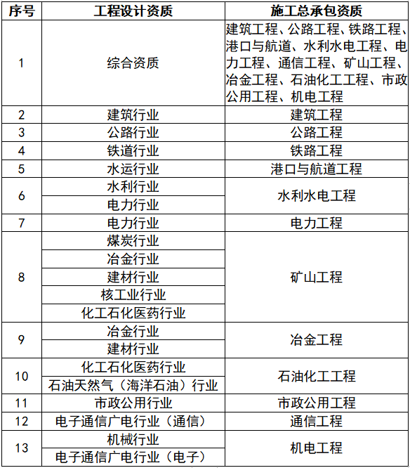 工程設(shè)計資質(zhì)與施工總承包資質(zhì)類別對照表