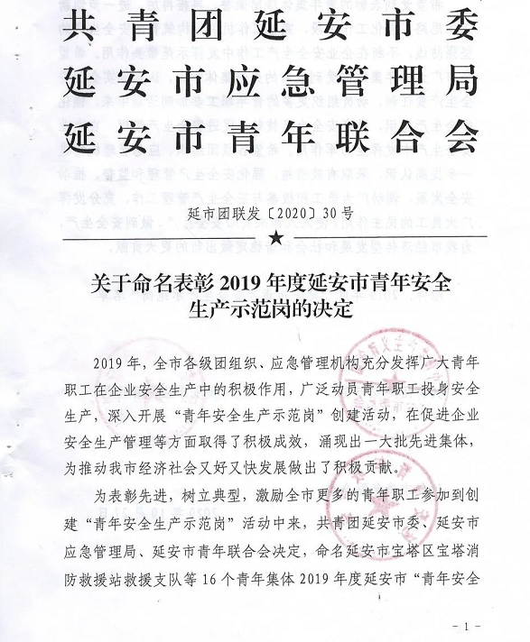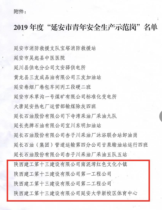 近日,共青團延安市委、延安市應急管理局、延安市青年聯合會聯合下發《關于命名表彰2019年度延安市青年安全生產示范崗的決定》,陜建十三建公司第一工程公司、第二工程公司、南泥灣紅色文化小鎮項目部、延安大學新校區體育中心項目部四個集體榮獲2019年度“延安市青年安全生產示范崗”榮譽稱號。