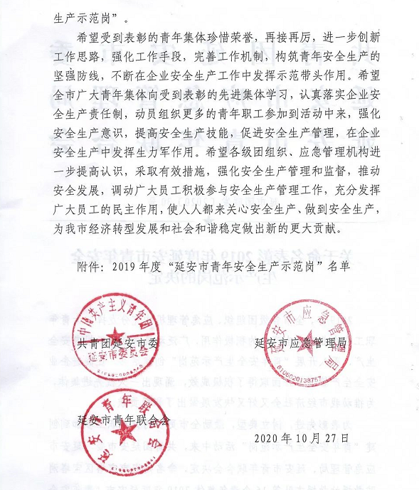 | 公司多個集體榮獲“延安市青年安全生產示范崗”稱號 |