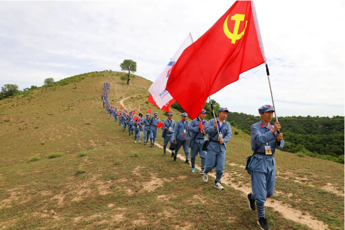 隨后,全體人員從甘泉縣圪嶗村出發,沿著當年紅軍走過的足跡,重走長征路,徒步6.8公里,到達九牛塔段。途中,全體人員學唱了《三大紀律八項注意》紅色歌曲,吟誦了《七律·長征》和《沁園春·雪》,聆聽了紅軍長征光輝事跡,體驗紅軍長征的艱辛,感受紅軍不畏艱險,英勇頑強的革命精神。