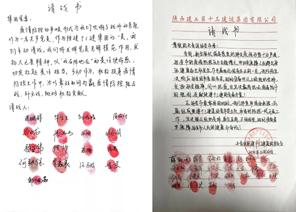 為了積極應對嚴峻的疫情防控形勢,在陜建十三建集團黨委的號召下,全體黨員干部、團員青年、90后、00后紛紛遞交請戰書,請愿赴一線服務疫情防控工作,助力延安市打贏疫情防控阻擊戰、殲滅戰。
