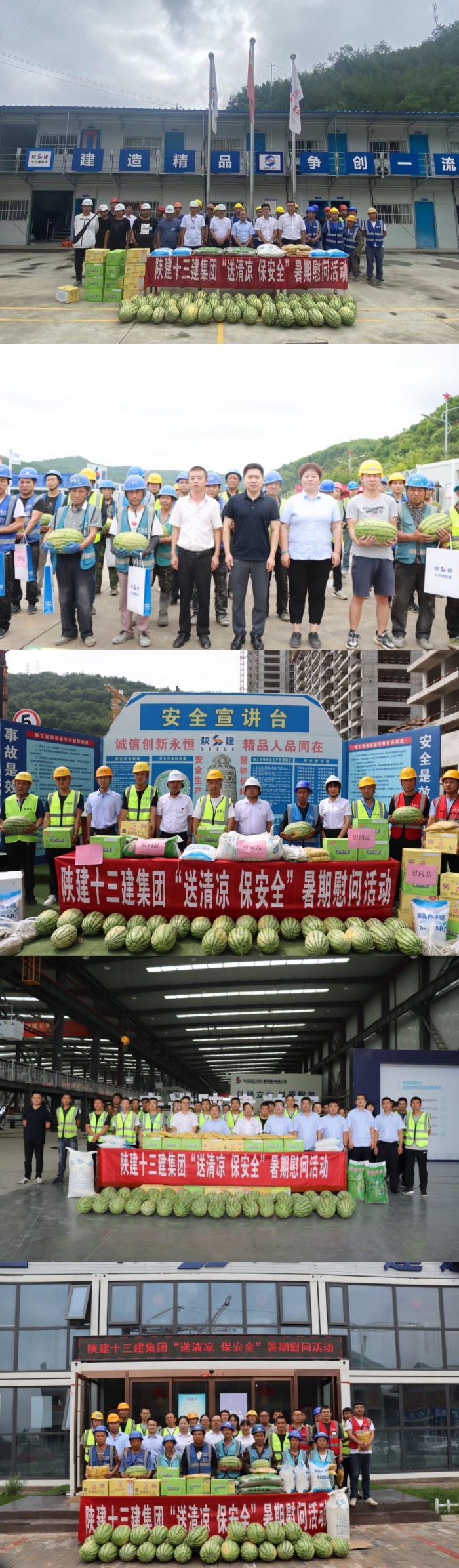 集團總工程師王弘起,副總經理楊永宏,副總經理張鑫偉,總會計師劉小衛,紀委書記、工會主席李靜分別前往延安市社會福利院遷建項目(一期)、延安南泥灣工匠學院項目、伴山樾谷·芳菲里項目、延安新型建材公司、信天游文創餐飲街區等項目開展慰問活動,代表集團公司對高溫天氣堅守在一線的廣大員工及工友表示親切的問候和衷心的感謝,并為大家送上西瓜、白糖、綠豆、菊花、冰糖、飲料、花露水等防暑降溫物品。同時,叮囑項目部要始終把安全放在首位,科學安排施工作業時間,做好后勤保障工作,制定防暑防汛工作預案,在確保一線施工作業人員健康安全的前提下抓質量提進度,緊盯項目節點目標,圓滿完成各項建設任務。
