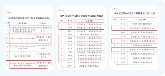 集團(tuán)延安市人民醫(yī)院改擴(kuò)建項(xiàng)目經(jīng)理部、延安市第二人民醫(yī)院(市傳染病專科醫(yī)院)改擴(kuò)建項(xiàng)目經(jīng)理部、陜甘寧邊區(qū)政府保安處革命紀(jì)念館項(xiàng)目經(jīng)理部被評(píng)為“2023年度延安市建設(shè)工程優(yōu)秀項(xiàng)目部”;吳小平、雷亞雄、高哲源、張溪強(qiáng)、汪強(qiáng)、湯勇、宋院輝等人被評(píng)為“2023年度延安市建設(shè)工程優(yōu)秀項(xiàng)目經(jīng)理”;李杰、忻煜、申虎等人被評(píng)為“2023年度延安市建設(shè)工程優(yōu)秀項(xiàng)目總工”。