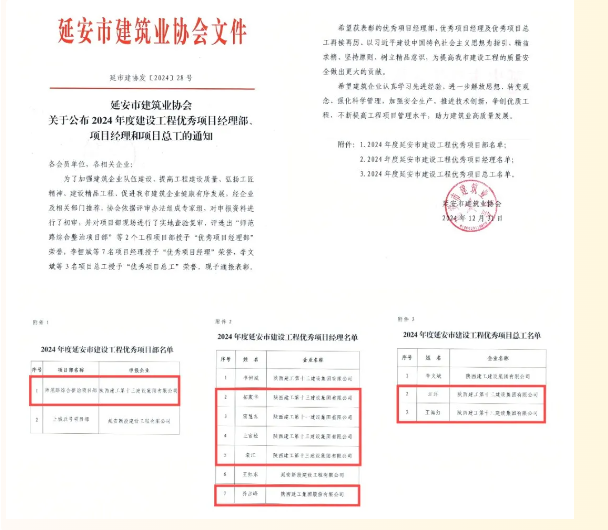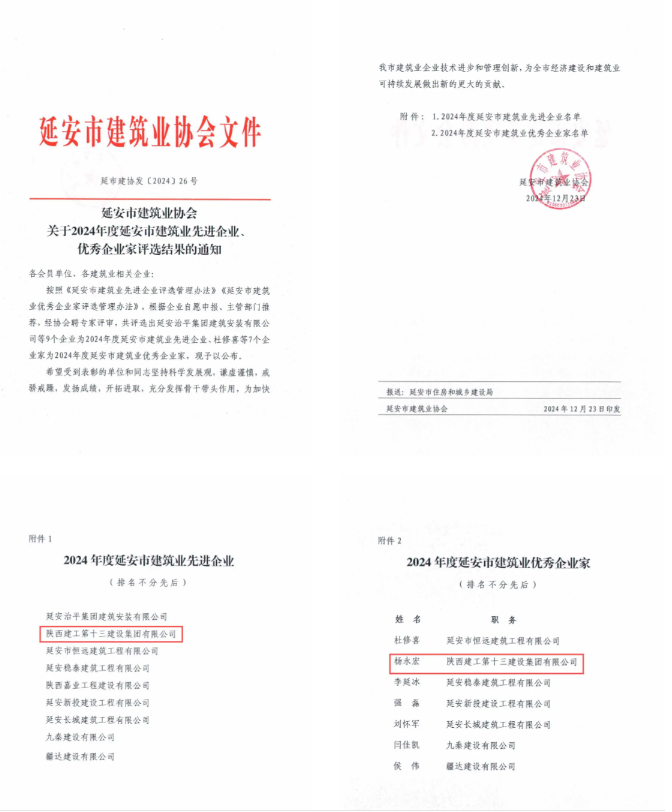 2024年,在延安市委、市政府和陜建集團(tuán)黨委的堅(jiān)強(qiáng)領(lǐng)導(dǎo)下,十三建集團(tuán)貫通落實(shí)黨的二十屆三中全會(huì)精神和習(xí)近平總書記歷次來陜考察重要講話重要指示,踐行“11359”工作方針,突出經(jīng)營提質(zhì)、改革蓄能、管理強(qiáng)基、品牌增效、黨建聚力“五個(gè)抓手”,沉著應(yīng)變、綜合施策,在復(fù)雜的環(huán)境和不利的行業(yè)形勢中穩(wěn)步前行,先后榮獲延安市建筑業(yè)穩(wěn)增長優(yōu)秀企業(yè)、全國工程建設(shè)AAA級(jí)信用企業(yè)等榮譽(yù)。